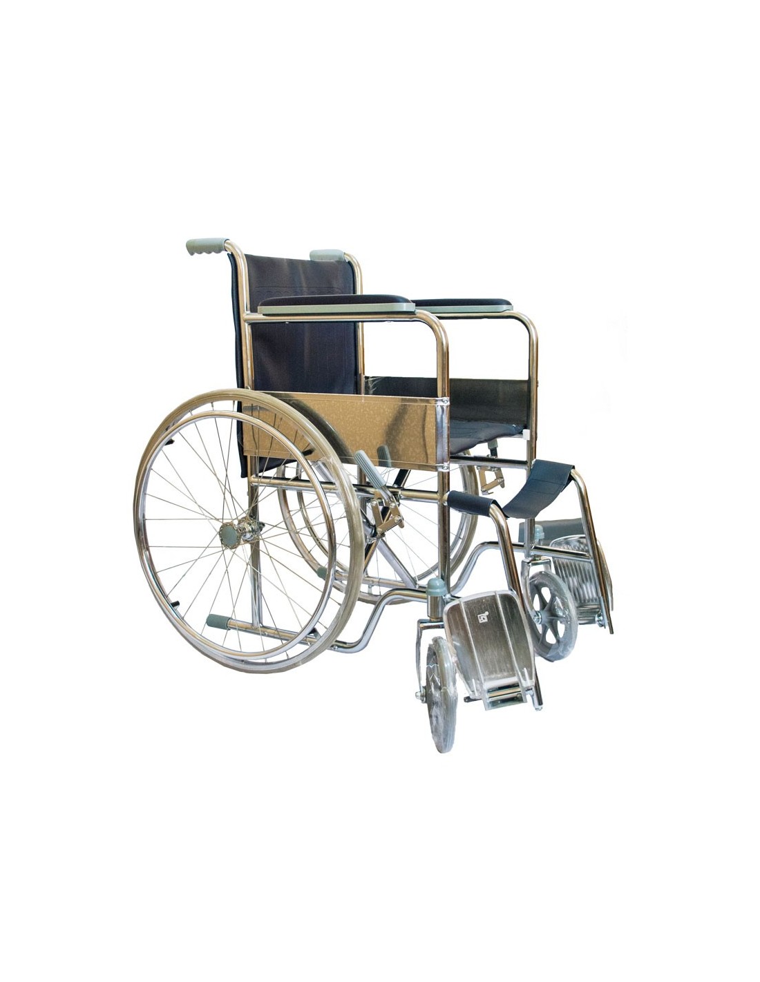 Silla de ruedas confeccionada en fierro cromado, con posa brazo fijo y posa pie ajustable. Características: Plegable, ruedas de goma masisa, asiento y posa brazo acolchado, tapiz lavable, peso 16,7 kg. Peso máximo recomendado para el usuario: 100 kg